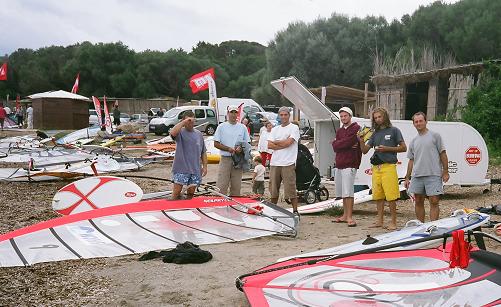 Inscription le matin, pas de vent, on règle le matos, bon repas avec le rouge qui va bien et puis soudain le vent se lève 15-20 noeud, parfait pour aller en Sardaigne......Tout le monde s'active, la pression monte, et nous voilà partis au golf de Spérone pour le départ , voile entre 7.0 et 7.8 pour l'équipe.